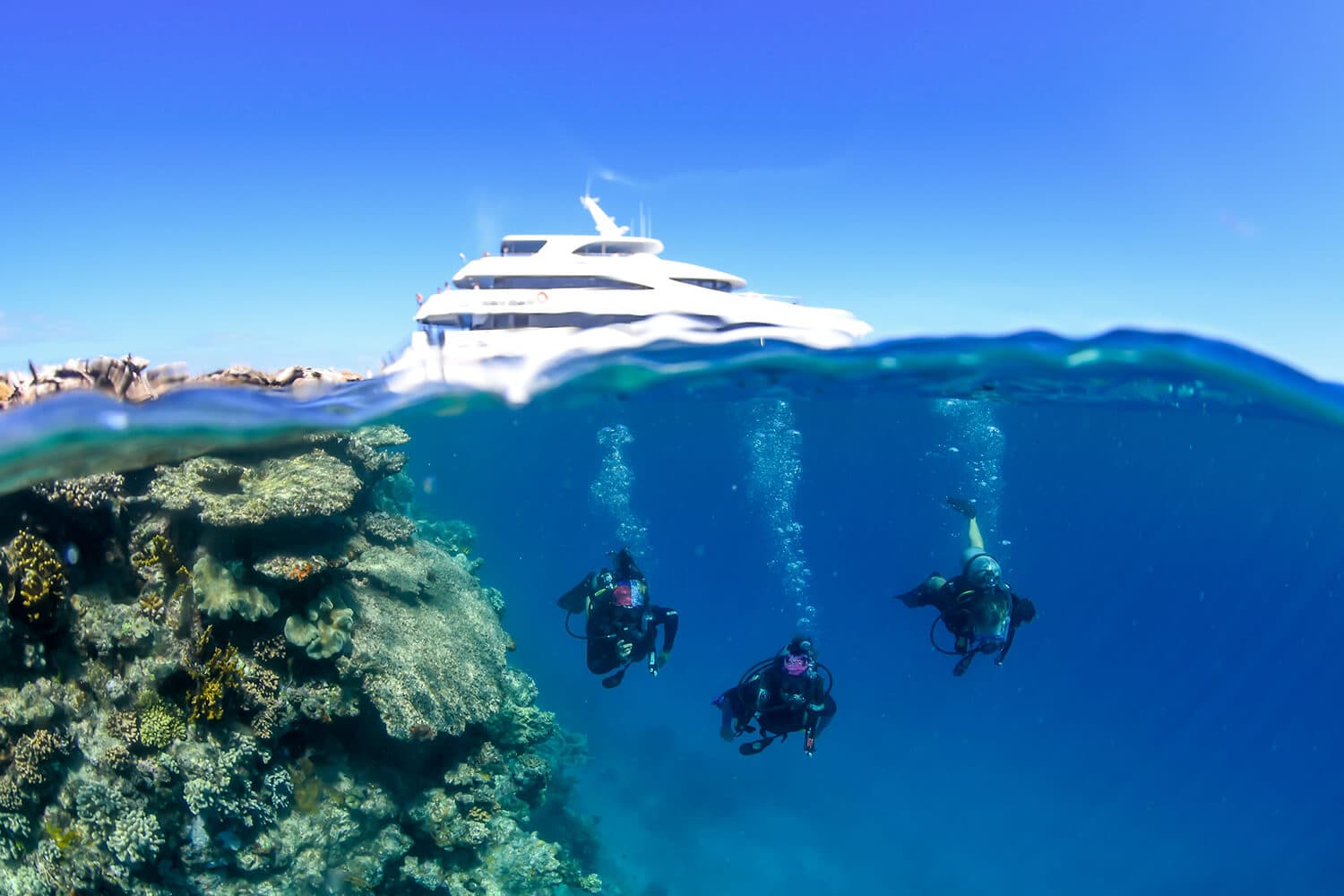 Cruise from Cairns at 8.15am onboard your luxury superyacht for the day to the Great Barrier Reef.